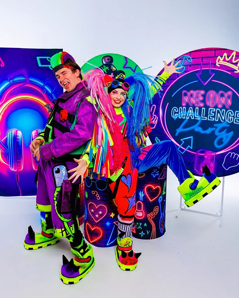 При заказе челленджа на 1,5 часа, к программе добавляется: -Неоновое лента-шоу -Челлендж «Воздушный тир» с шариками и дротиком -Танцевальный челлендж «Повтори танец» за участниками в классных надувных костюмах Розового Фламинго и Инопланетянина -Гигантские неоновые надувные подушки 1,5 на 1,5 метра