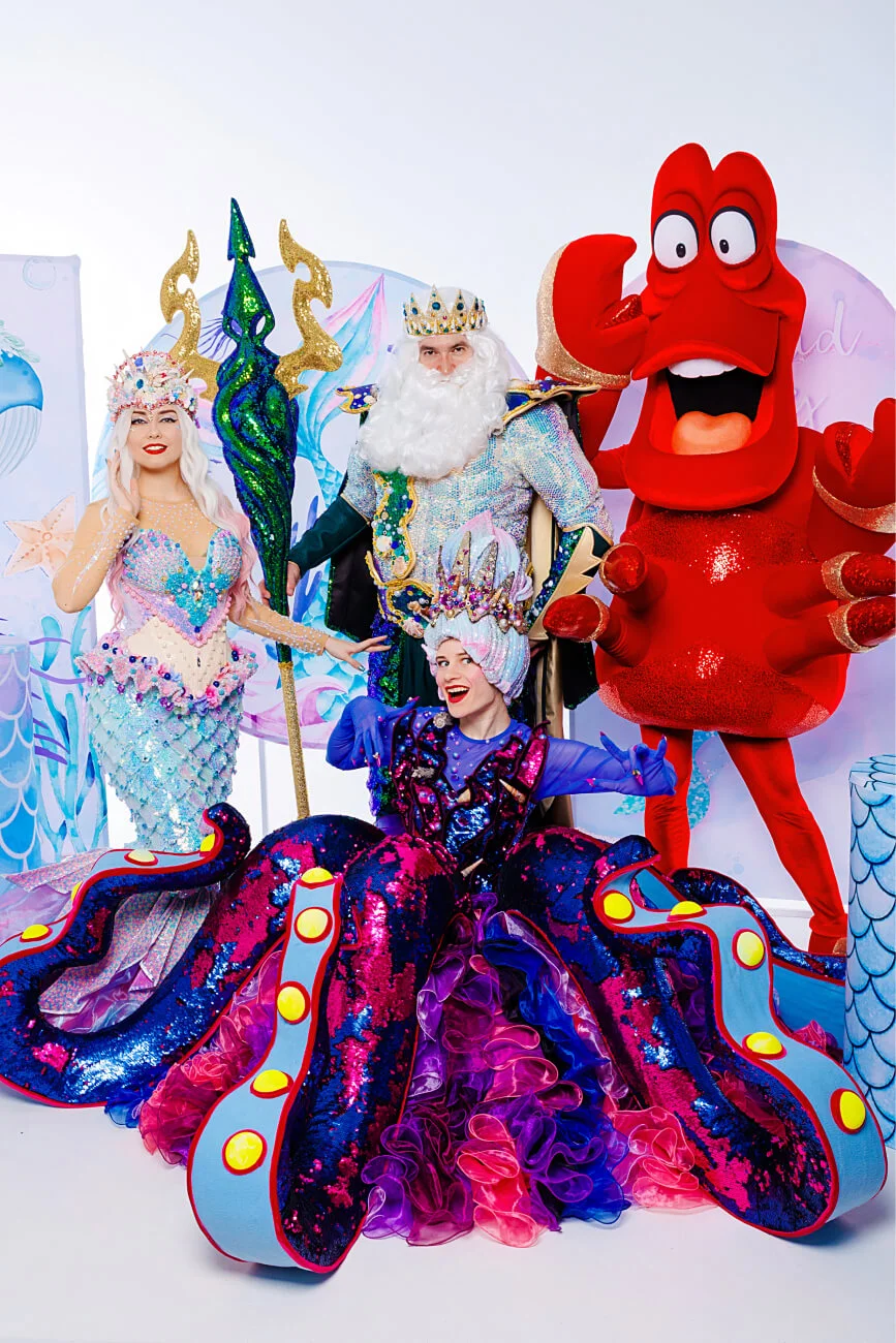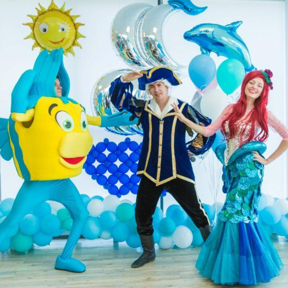 1,5 часа, 3 артиста (Русалочка, Нептун, Урсула или ростовая кукла Краб на выбор (1 час), полный квест: -Поле логики в морском стиле -Большой Кальмар -Игра «Виды рыбок» -Водоросли и морские жемчужины -Головоломка «Морская черепаха» -Игра «Ядовитая медуза» -Эстафета на скатах -Большое полотно с морской звездой и ракушками -Мешки-хвосты русалочек