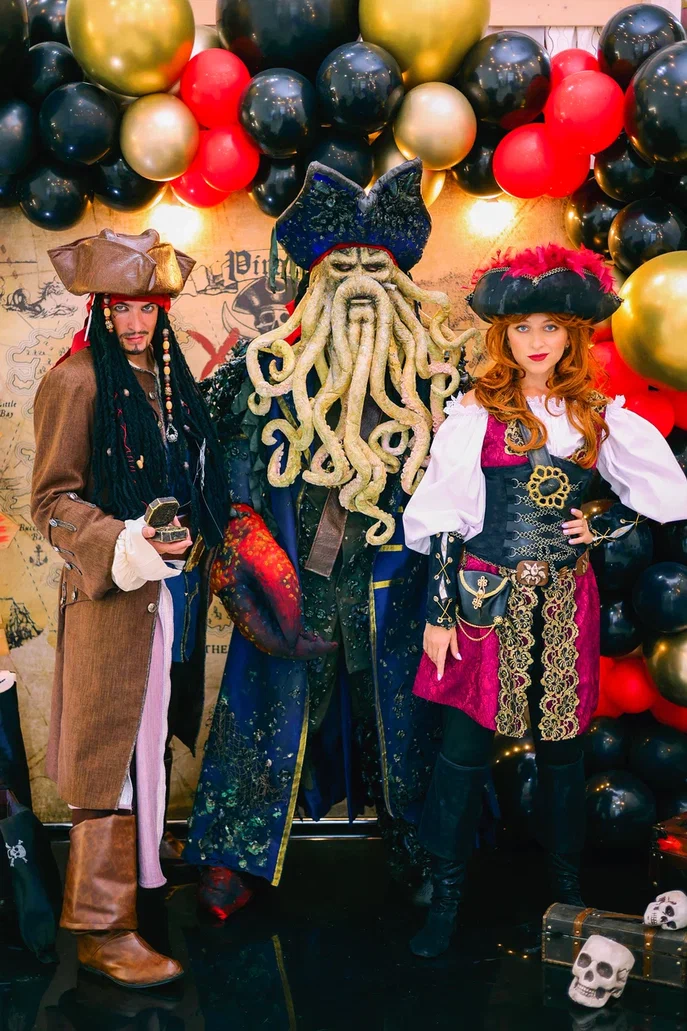 1,5 часа, 3 артиста (Пиратка Рэд, Джек Воробей и ростовая кукла Дэйви Джонс (1 час), полный квест: -Первая головоломка круги-карта -Головоломка «Черные метки» -Игра с пиратскими крюками и кольцами -Игра перетягивание каната -Игра пиратская бомба -Игра пиратский флаг -Шифр и кодовый замок -Головоломка с пиратской бутылкой -Эпизод с Дейви Джонсом, сцена с героем -Загадки от Дейви Джонса -Головоломка пиратских пиастр (монет) -Сценка со щупальцой -Игра «Кракен» -Головоломка-штурвал -Финальная сцена с Дейви Джонсом