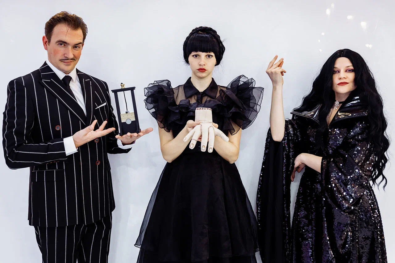 1,5 часа, 3 артиста, полный квест: -Большая книга семейки Аддамс -Подвижная игра «Хищный цветок» -Пальчиковая гильотина -Кровавые крестики-нолики -Головоломка с буквами -Витраж Уэнсдей -Игра Печатная машинка -Челлендж круг черно-белый -Гигантский глаз -Игра «Вещь»
